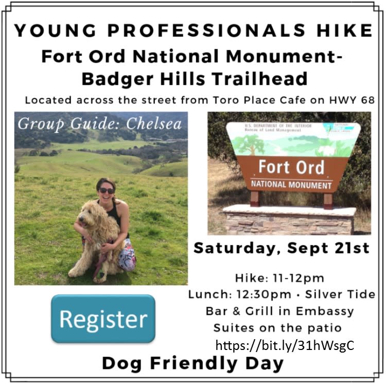 Join us for our guided hike on Badger Hills Trailhead. The trailhead is located across the street from Toro Place Cafe on Highway 68. Bring water, a small snack, and wear sunscreen. The hike will be slightly hilly, so wear a pair of running shoes or tennis shoes.