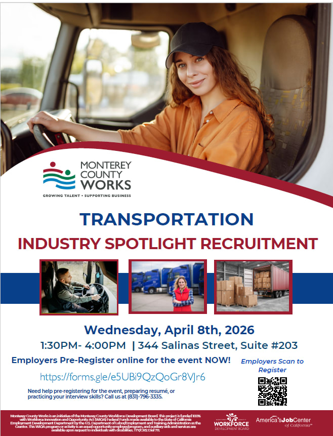 Businesses are invited to register for our Industry Spotlight Recruitment -Transportation on Wednesday, April 8th from 1:30pm-4pm at our Monterey County Works, Salinas Career Center. Businesses searching for bus drivers, CDL Class A Truck Drivers, Vanpool and more are encouraged to attend.